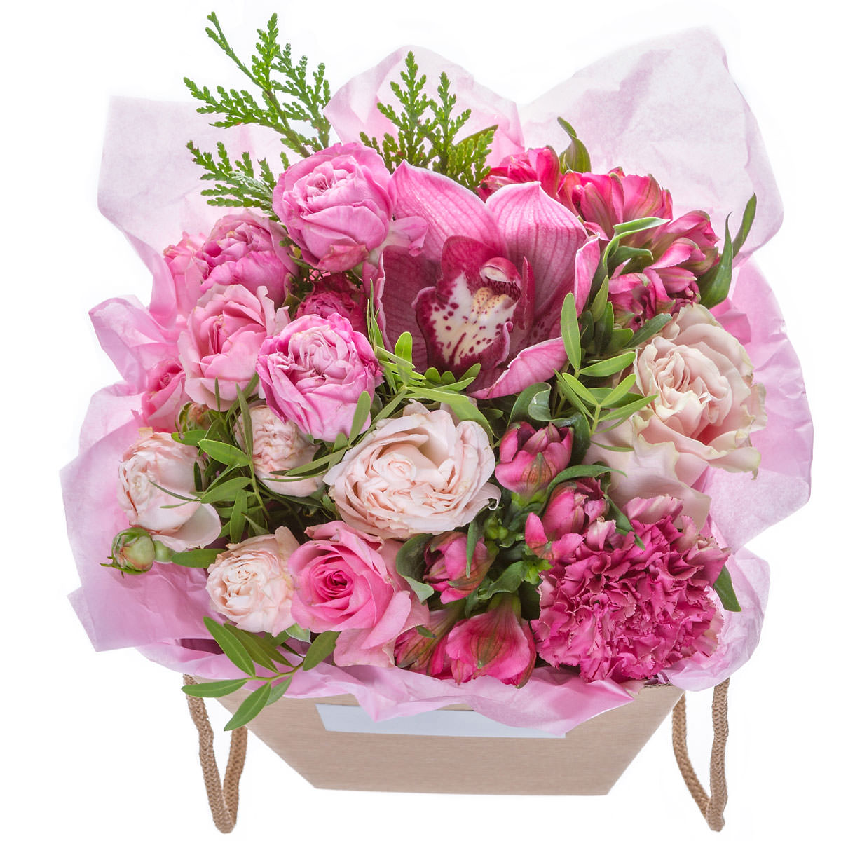 Роза одноголовая розовая, пион светло-розовый, альстромерия розовая, орхидея розовая, гвоздика розовая, туя, фисташка. Упаковка (шляпная коробка, квадратный бокс, коробка сердце, оазис)