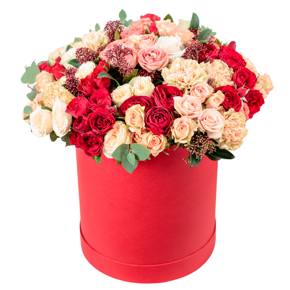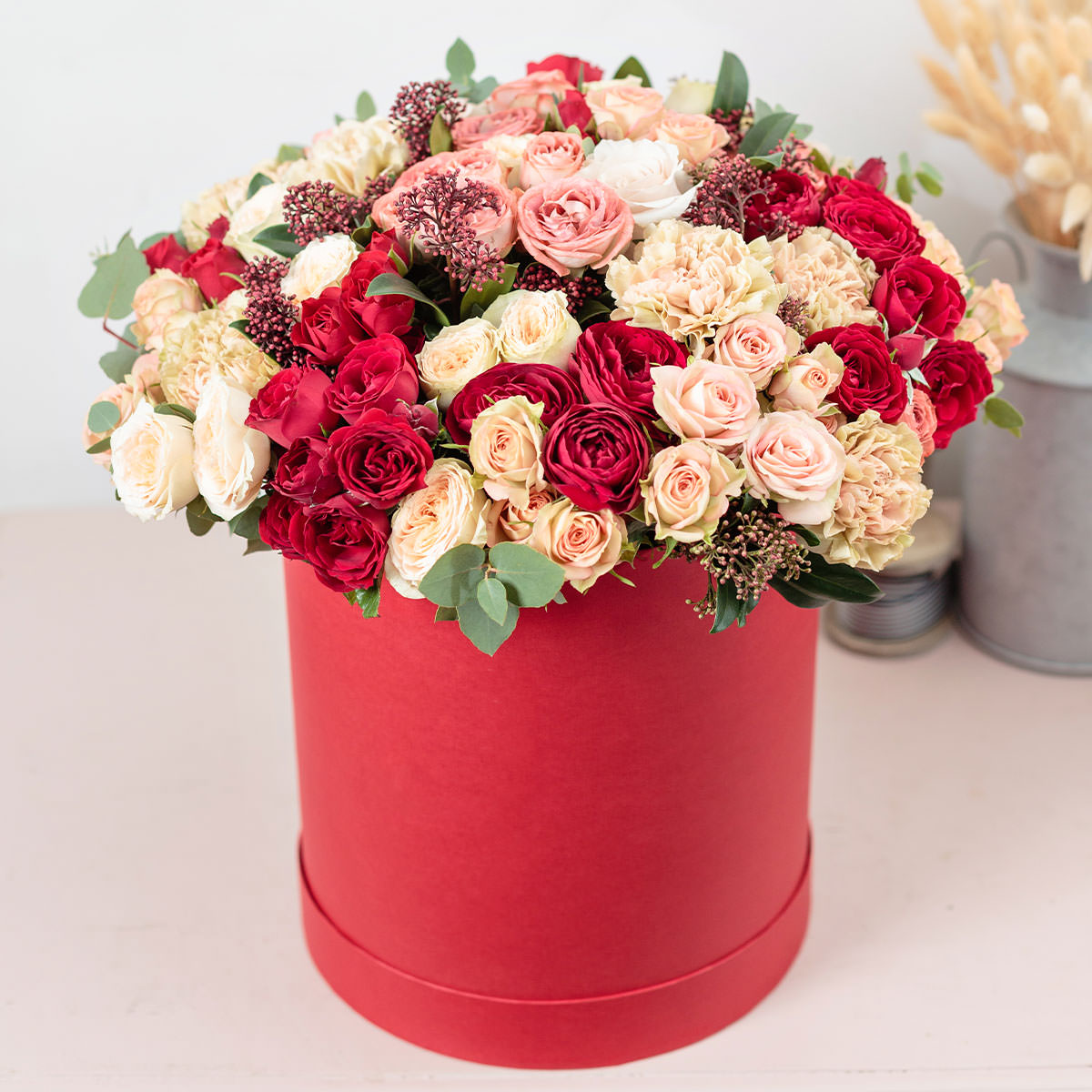 Роза кустовая пионовидная красная, роза кустовая розовая, гвоздика розовая, озотамнус, эвкалипт. Упаковка (шляпная коробка, квадратный бокс, коробка сердце, оазис)